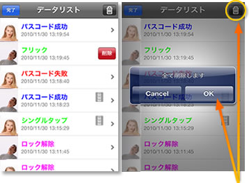 | 削除したいリストを左右にフリップすることで、リストの1件削除ができます。 | リストを全件削除したい場合は、アイコンをタップします。 |